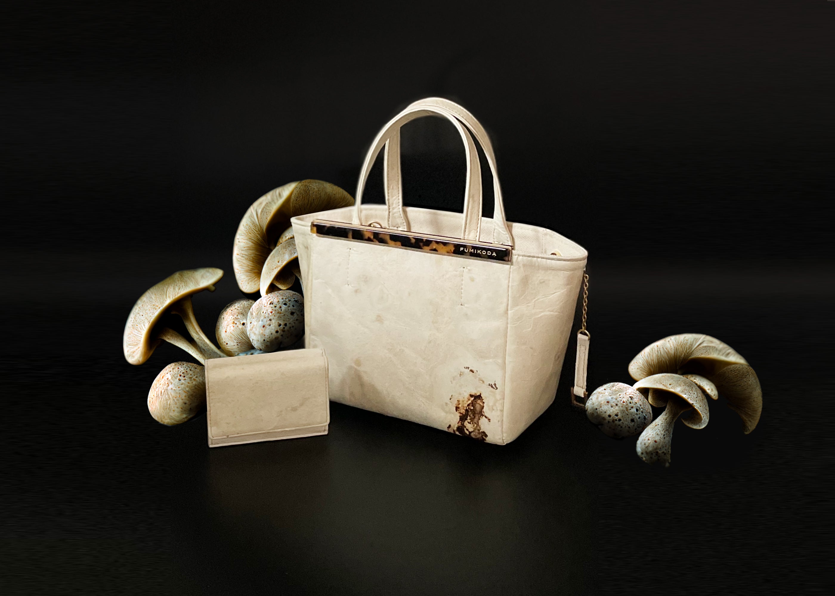 そして、弊社のマッシュルームレザー技術と、FUMIKODAさんのデザイン力、縫製する工房の職人の技術を結集し、100%天然素材で出来たマッシュルームレザーの財布とトートバッグが完成しました。